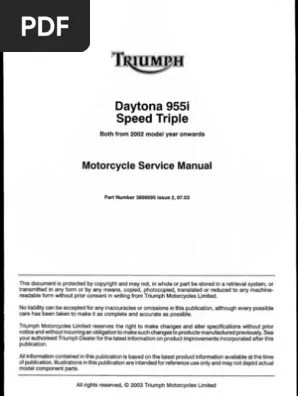 Ccpr ccps warning caution and note caution throughout this owner s handbook. Motorcycle triumph daytona 955i 2002 service manual 385 pages motorcycle triumph 2003 daytona. Triumph 675 wiring diagram diagrams posts. Triumph daytona 955i and speed triple 955 service manual 2002 2006 download now triumph bonneville 2001 2007 service repair manual download now triumph bonneville 2001 2007 workshop service repair manual download now.